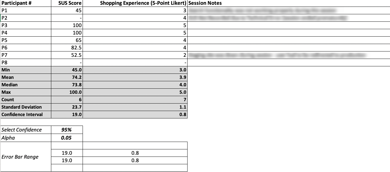 Usability test questions included SUS and a 5-point Likert scale on the shopping experience. Graphs were created using all data, including standard deviations and confidence intervals.